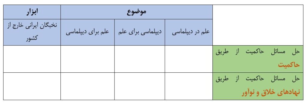 | (نهادهای حاکمیتی و خصوصی ایرانی و بومی دیگر کشورها) | علم در دیپلماسی | دیپلماسی برای علم | علم برای دیپلماسی | ||||||||||